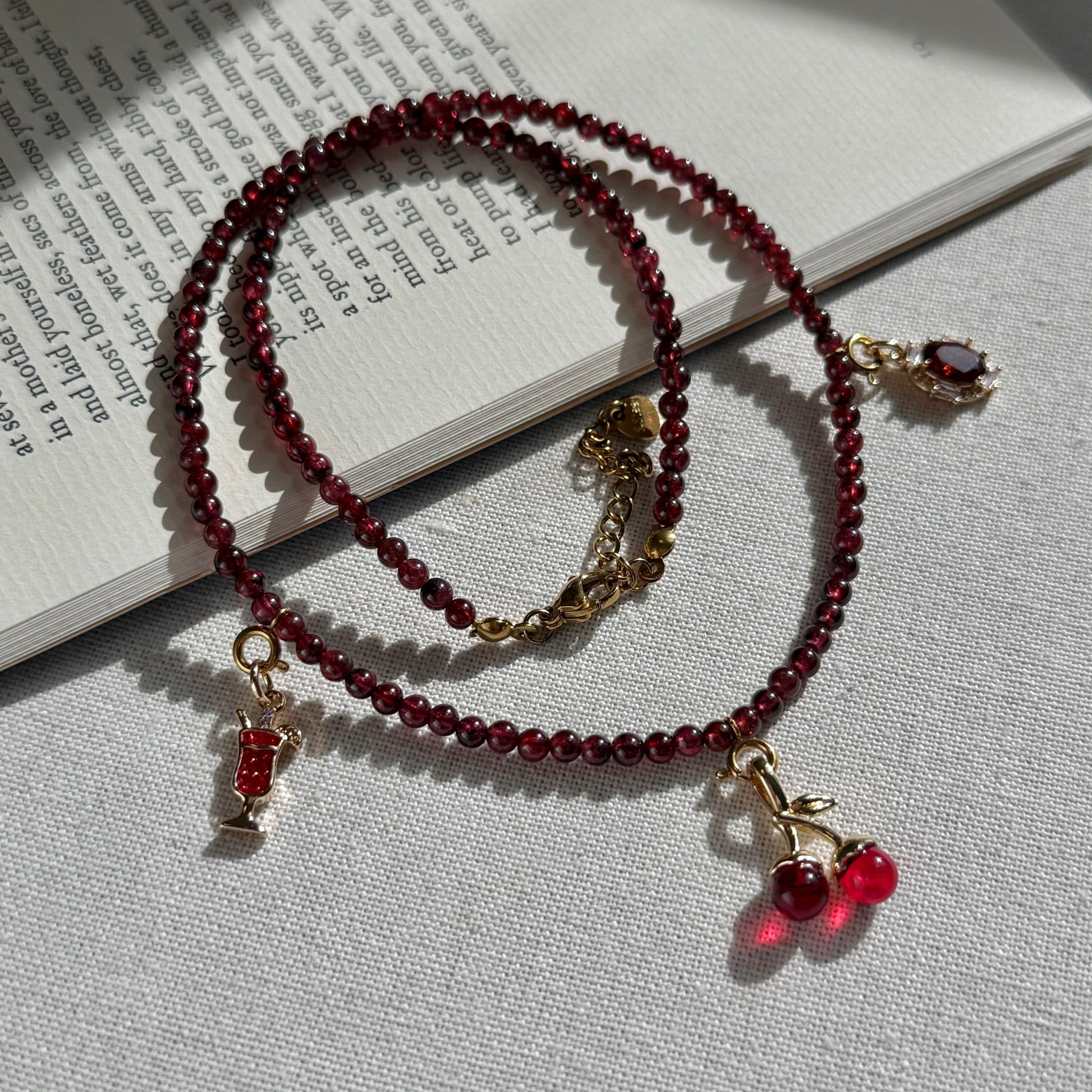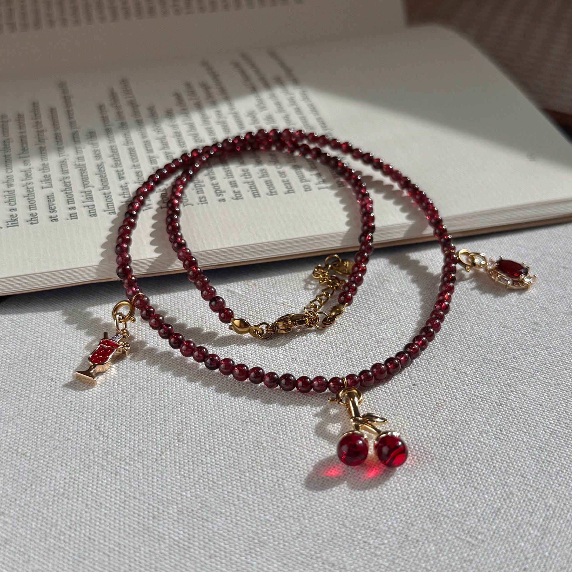 Necklace Material: Natural Garnet, showcasing a deep, fiery red hue reminiscent of a rich wine. Along with one 18k gold plated stainless steel charm holder.