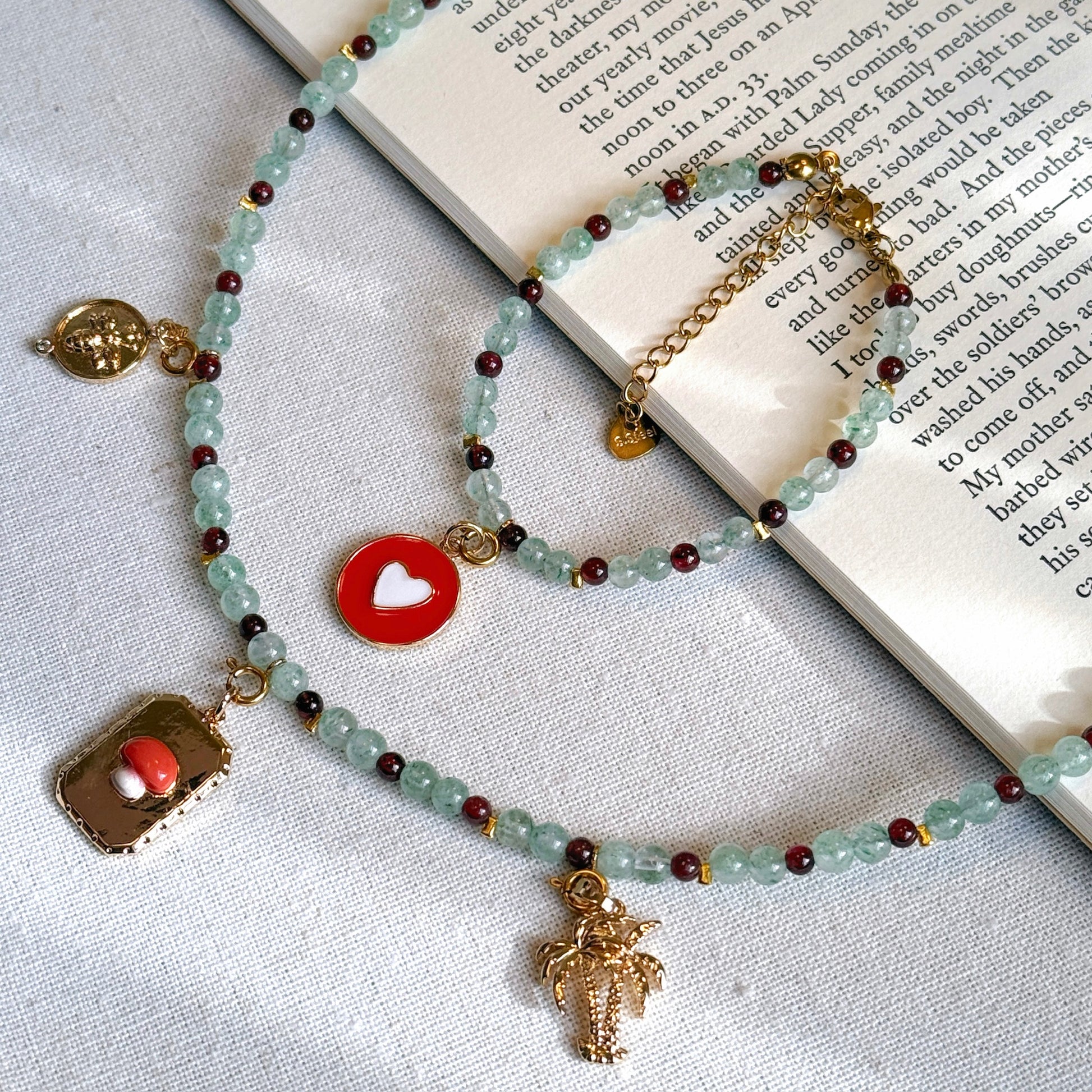 Material: This piece features a harmonious blend of Natural Green Aventurine and Genuine Red Garnet. We selected the quartz for its gentle, misty green color and subtle mineral inclusions, while the garnet—a stone of passion and vitality—adds a rich, sophisticated touch to the holiday palette.