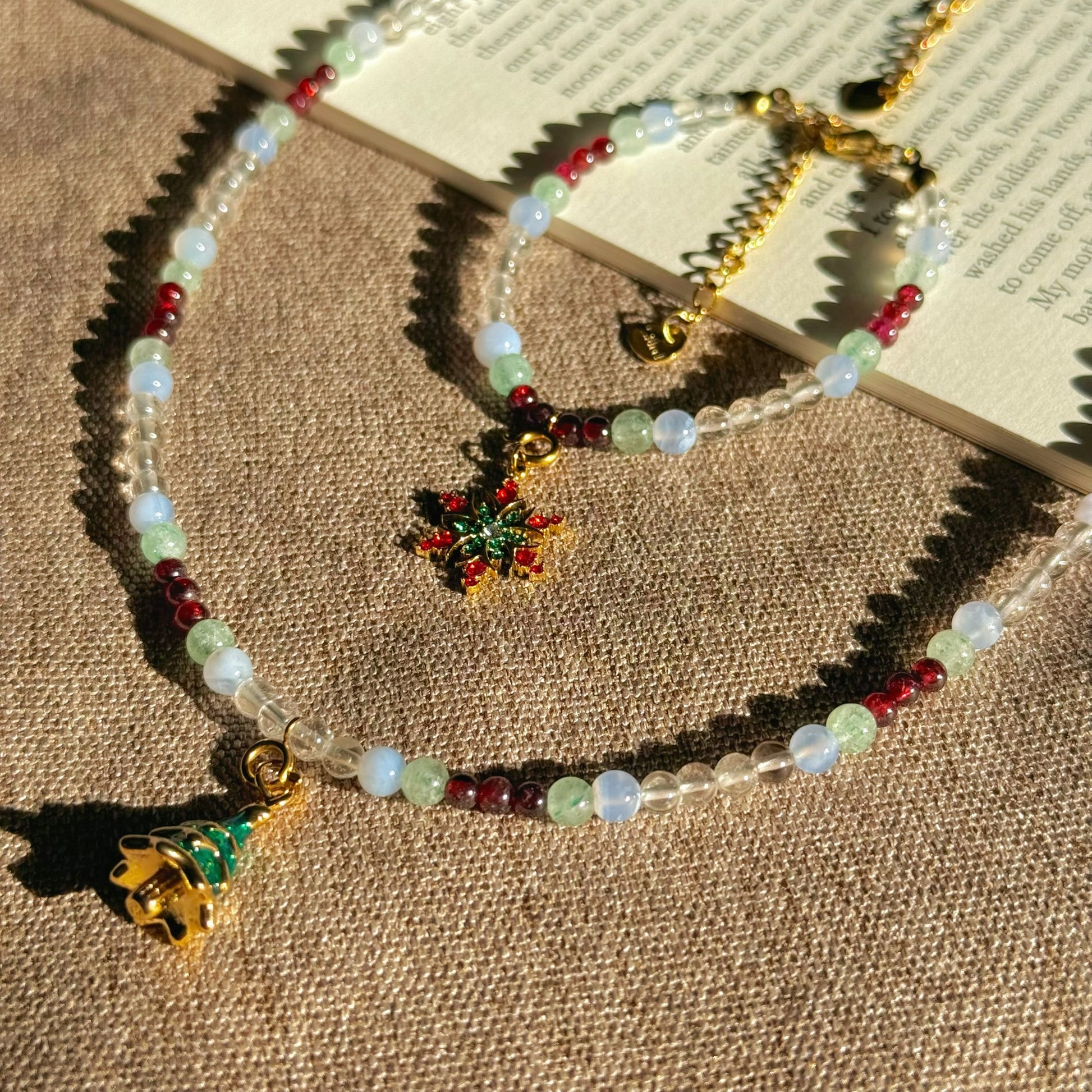 Material: This set features high-quality Natural Garnet beads as deep red accents, paired with the forest-green shimmer of Green Aventurine, the soft, sky-blue ripples of Blue Lace Agate, and the crystalline clarity of Clear Quartz. Each piece is finished with 18k gold-plated accents and whimsical enameled holiday charms—a sparkling Christmas Tree and a brilliant Red & Green Snowflake.