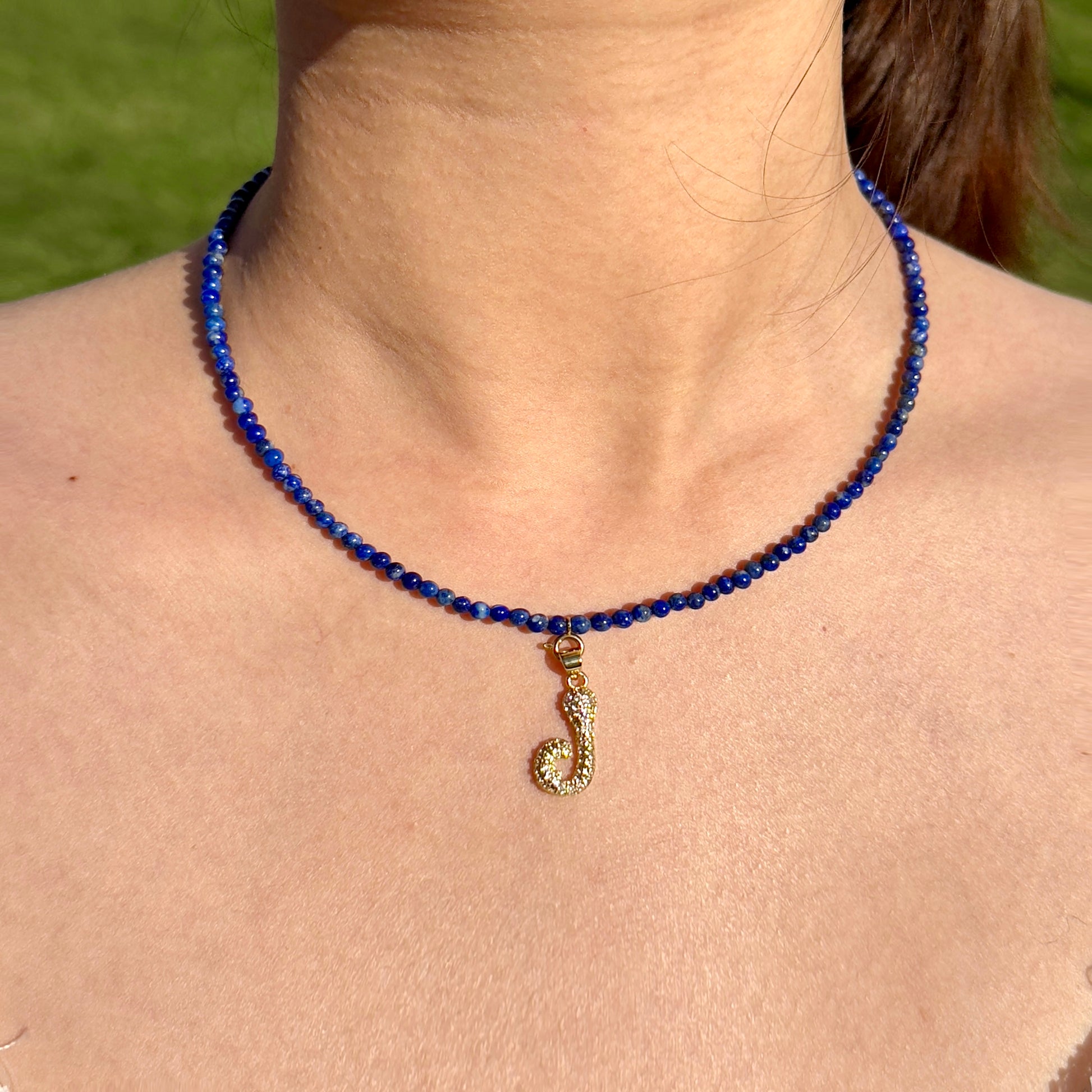 Material: Natural Lapis Lazuli, featuring a deep celestial blue, often speckled with natural golden flecks of Pyrite. Along with 18k gold plated stainless steel charm holders.