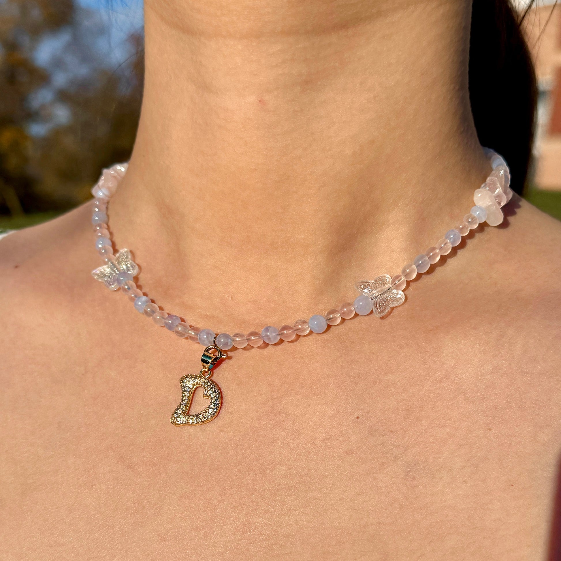 Material: Crafted with genuine Blue Lace Agate and Rose Quartz crystal beads, this set features elegant butterfly beads and 18k gold-plated charm hardware, including a golden initial letter charm.
