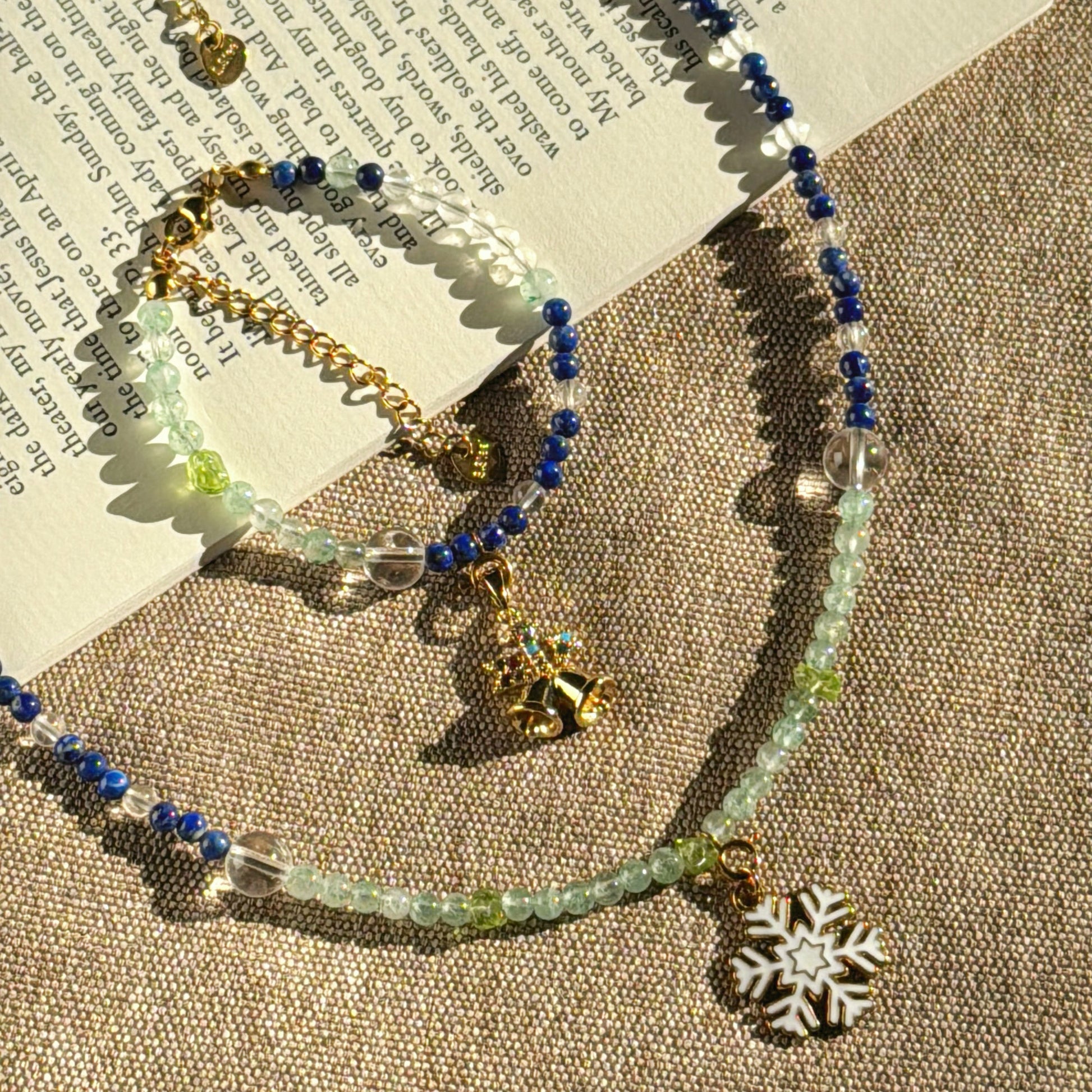 Material: High-quality natural gemstones including deep blue Lapis Lazuli, translucent Green Aventurine, and crystalline Clear Quartz. The design is elevated by whimsical 18k gold-plated charms, featuring a delicate enameled snowflake and a festive golden bell, symbolizing the quiet joy of the winter season.