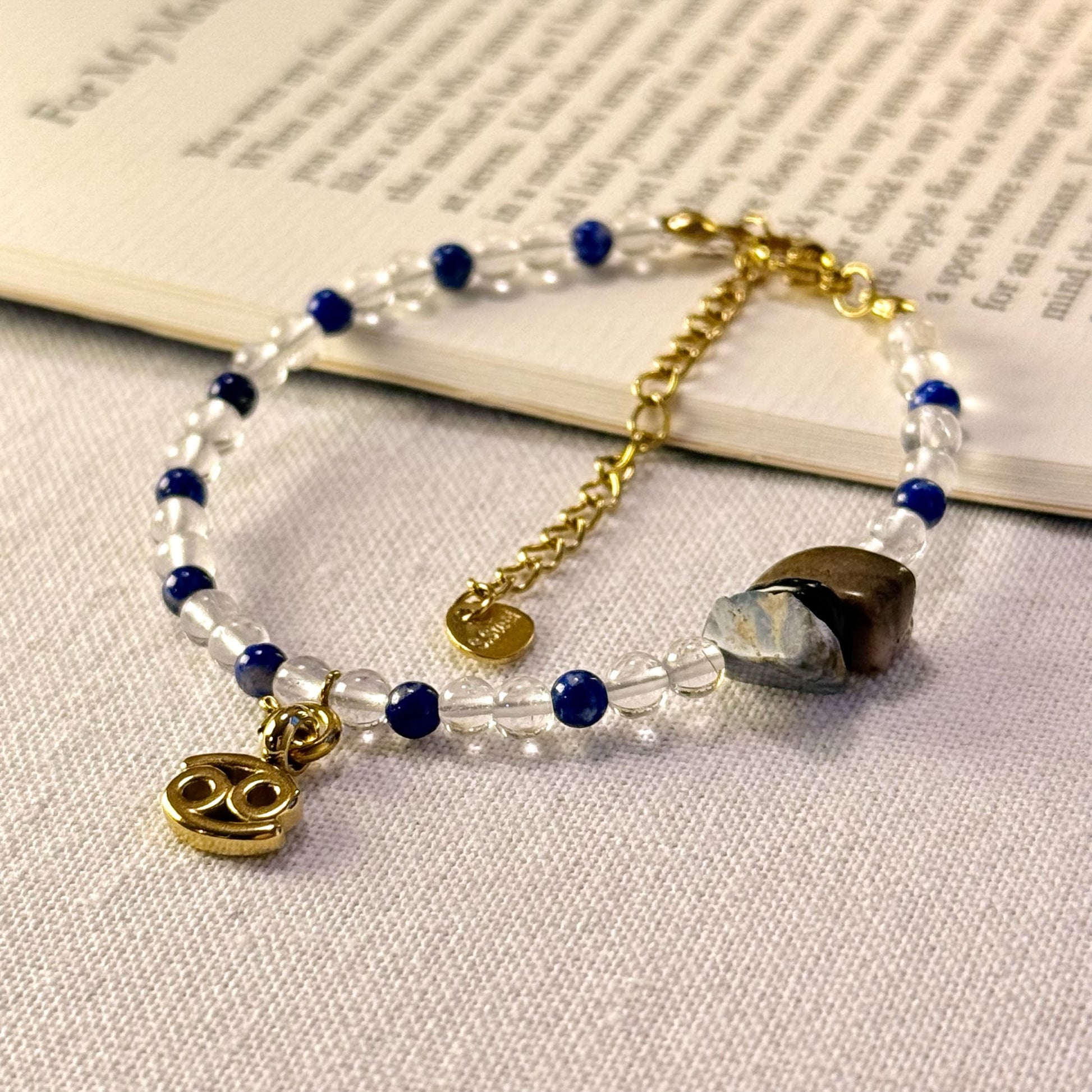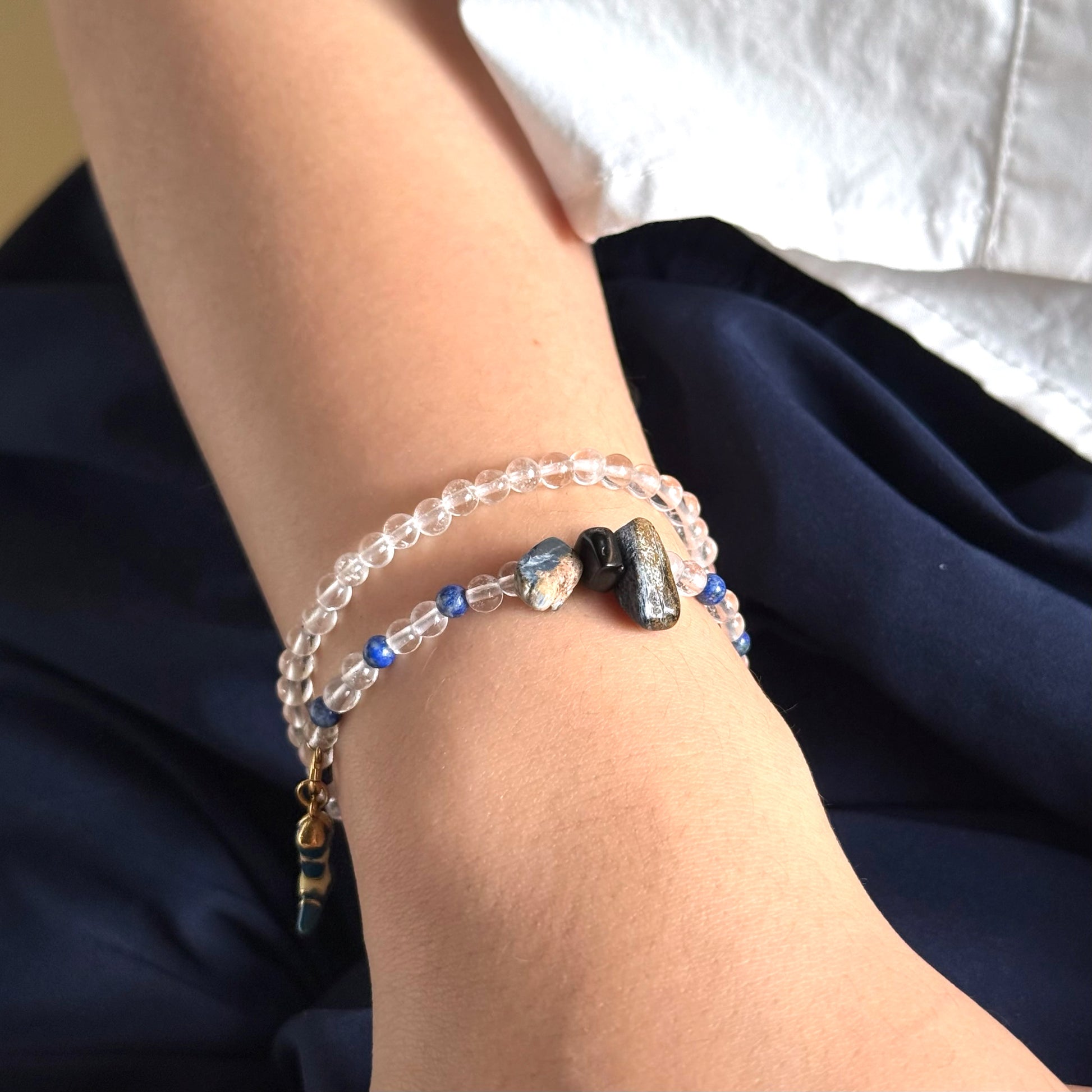 Immerse yourself in the perfect fusion of the mysterious glow of natural gemstones and exquisite craftsmanship. The "Mystic Starlight" jewelry set is a chain-style necklace and bracelet collection brimming with wisdom, clarity, and courage. It features the deep tones of Lapis Lazuli and the clarity of Clear Quartz as its foundation, cleverly accented with rare Pietersite, bringing you a guarding energy that shines like the stars.
